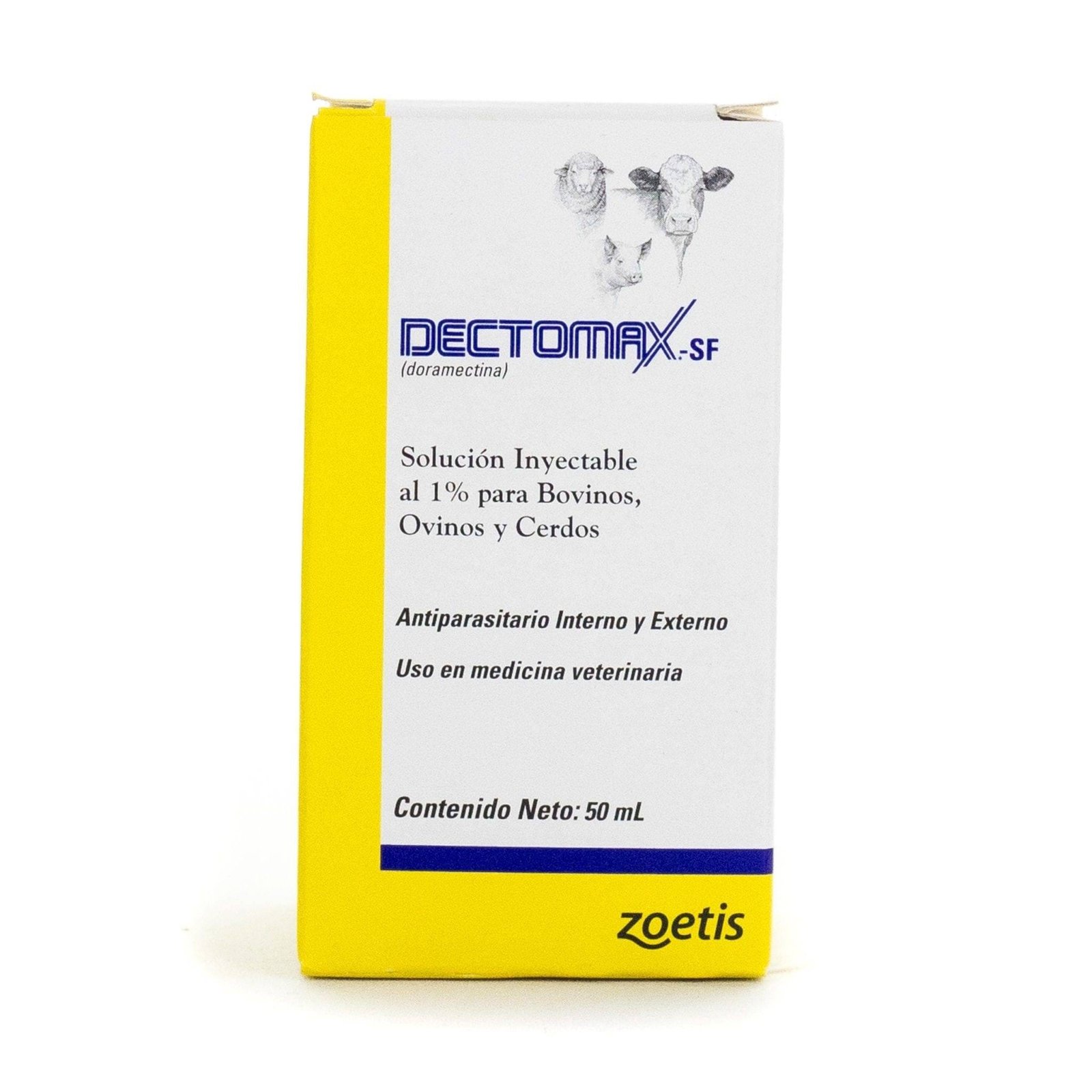 Dectomax es un nombre comercial para un medicamento antiparasitario que contiene el principio activo doramectina . Es un producto veterinario utilizado para tratar y controlar una amplia variedad de parásitos internos y externos en animales de granja, como bovinos, ovinos y porcinos. Se usa principalmente para tratar la sarna, la miasis y parásitos tanto internos como externos.